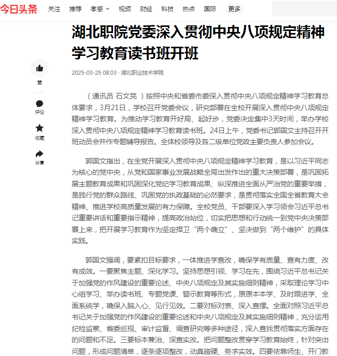 【今日头条】湖北职院党委深入贯彻中央八项规定精神学习教育读书班开班