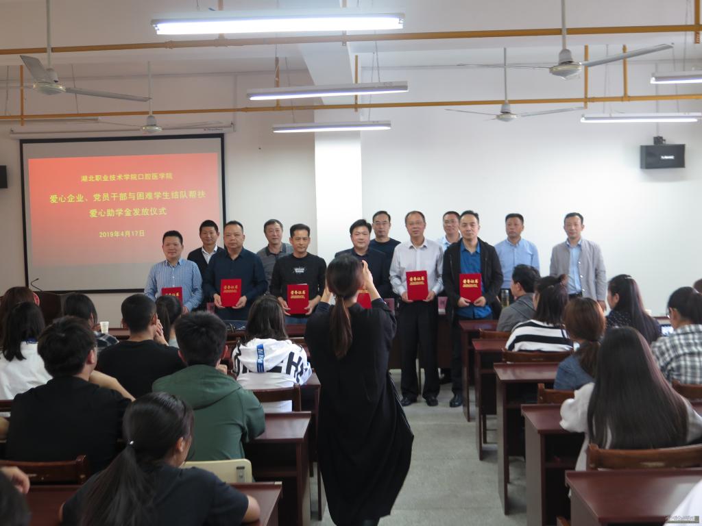 仪式上,出席活动的嘉宾向15名贫困学子每人发放了1000元爱心助学金。口腔医学院负责人廖建宏向爱心企业代表颁发了“爱心团体”牌和“爱心人士”证书。受助学生代表——2018级口腔医学专业学生孙倩,深情地表达了奋发图强、回报社会的决心;“爱心企业”代表孝感市口腔医学会民营口腔专委会会长涂艮斌表示,今后将继续创造条件资助更多的贫困学生,为社会公益事业多做贡献。党委宣传部、学工部相关负责人分别发言,对爱心企业表示衷心的感谢,希望困难学子要把困难当成励志的磨练,放下思想包袱,树立远大的理想,努力学好专业知识,以实际行动回报国家和社会。