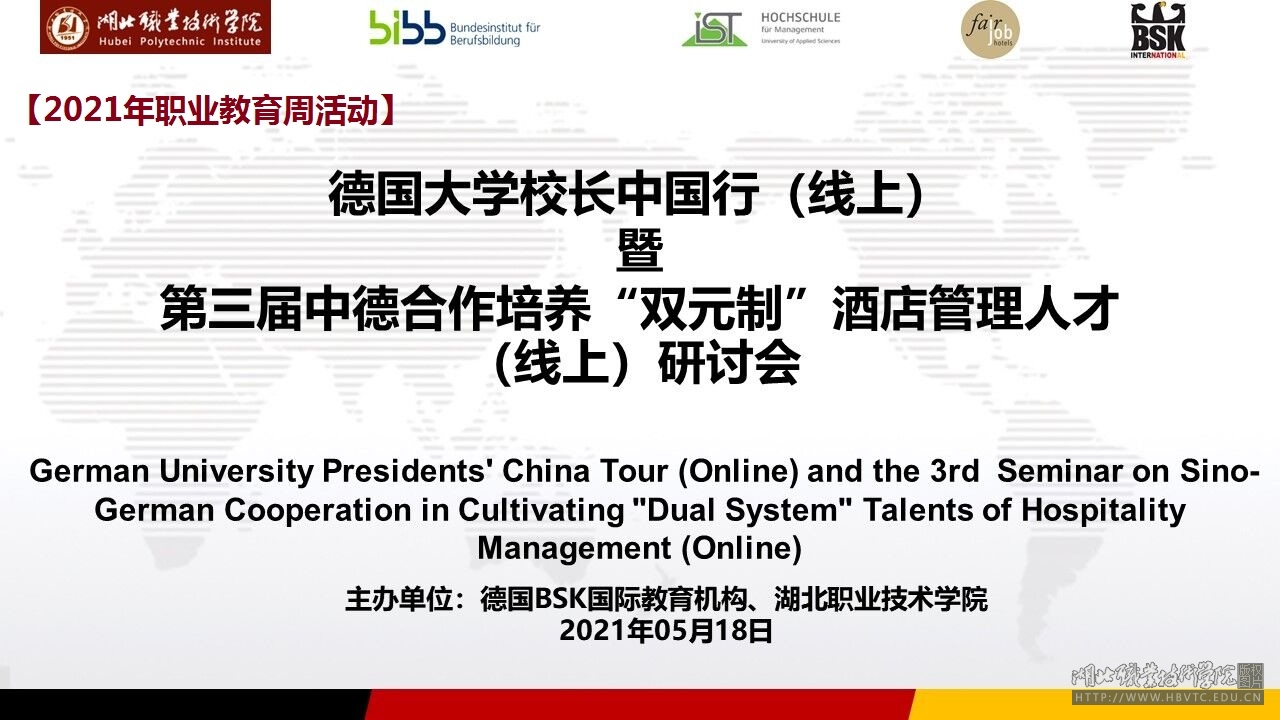(本网记者:致和 陈灏)值2021年全国职教活动周来临之际,2021年德国大学校长中国行暨第三届中德合作培养“双元制”酒店管理人才研讨会于5月18日下午在我校顺利召开。本次会议由江南官方注册_江南(中国)官方与德国BSK国际教育机构共同主办,采用线上线下相结合的方式进行,主会场设在我校文德楼二楼会议室。