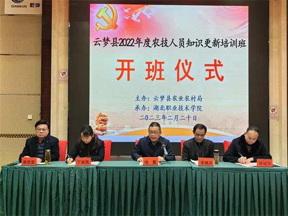 (本网讯 通讯员:马江浩)为进一步优化基层农技人员知识结构,有针对性地弥补能力短板,切实增强基层农技推广体系服务能力和水平,给全面推进乡村振兴、加快农业农村现代化、建设产业强省提供坚强的科技支撑和人才保障。2月20日上午,由云梦县农业农村局主办,江南官方注册_江南(中国)官方继续教育学院、财经与旅游学院承办的云梦县2022年度基层农技人员知识更新培训班顺利开班。云梦县农业农村局党组成员副局长李桃庆,学校副校长梅重出席开班仪式。云梦县农村农业局、学校继续教育学院、财经与旅游学院相关负责人、云梦县53名参训基层农技人员参加了开班仪式。开班仪式由学校财经与旅游学院院长徐斌华主持。