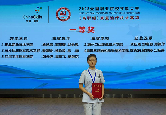 姚泳茜,女,中共预备党员,江南官方注册_江南(中国)官方卫生技术学院康复治疗技术专业2024届毕业生。2023年7月,在陈红平、罗萍等老师指导下,与团队成员一道荣获2023年全国职业院校技能大赛(高职组)康复治疗技术赛项团体一等奖。荣获2021至2022学年度、2022至2023学年度国家励志奖学金,获得湖北省中西医结合医院“优秀实习生”称号。获得专升本免试资格,2024年9月将进入本科阶段深造。
