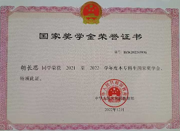 2022年12月,胡长思荣获2021至2022学年度国家奖学金
