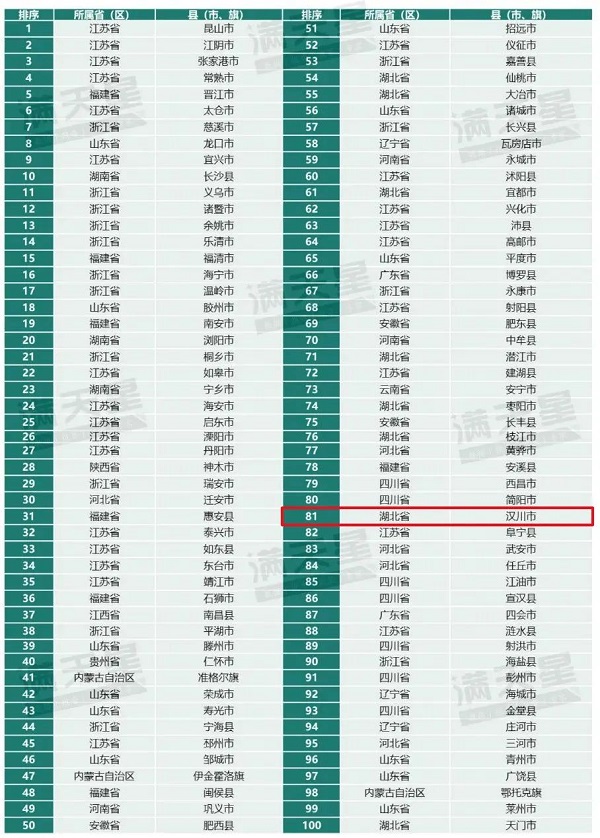 孝感市汉川市位居榜单第81位
