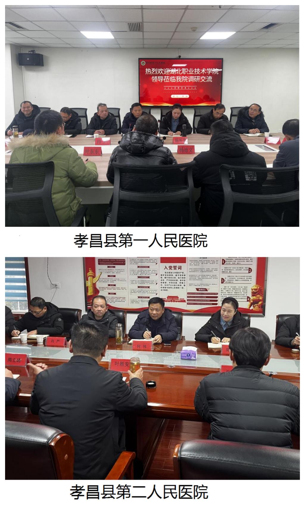 在孝昌县第一人民医院和孝昌县第二人民医院,调研团队详细了解了医院的发展历程、现状及未来规划,并就实习学生管理、化解教学同质化、优化课程体系及提升学生实践能力等问题与医院进行了深入探讨。