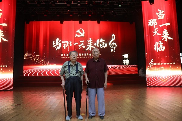 (湖北职院97岁的魏迪仁老师与省军区孝感干休所98岁的胡克祥同志在湖北职院崇德礼堂红色音乐党课现场)